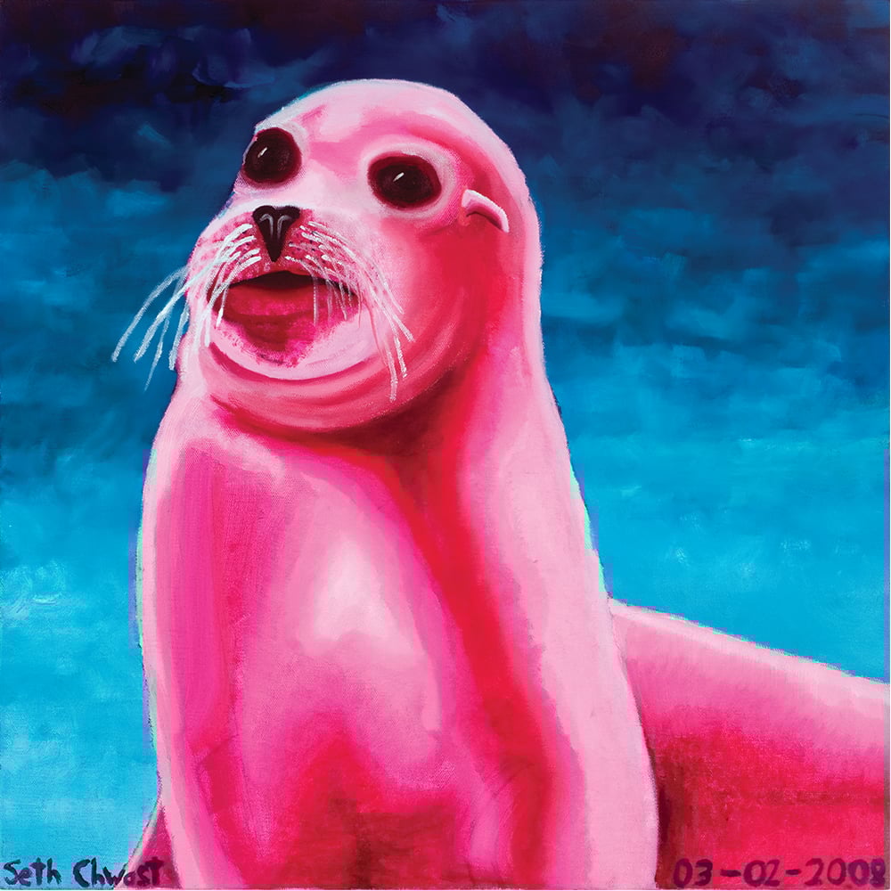 Signed and numbered print of "The Hot Pink Sea Lion on Blue" by Seth Chwast.