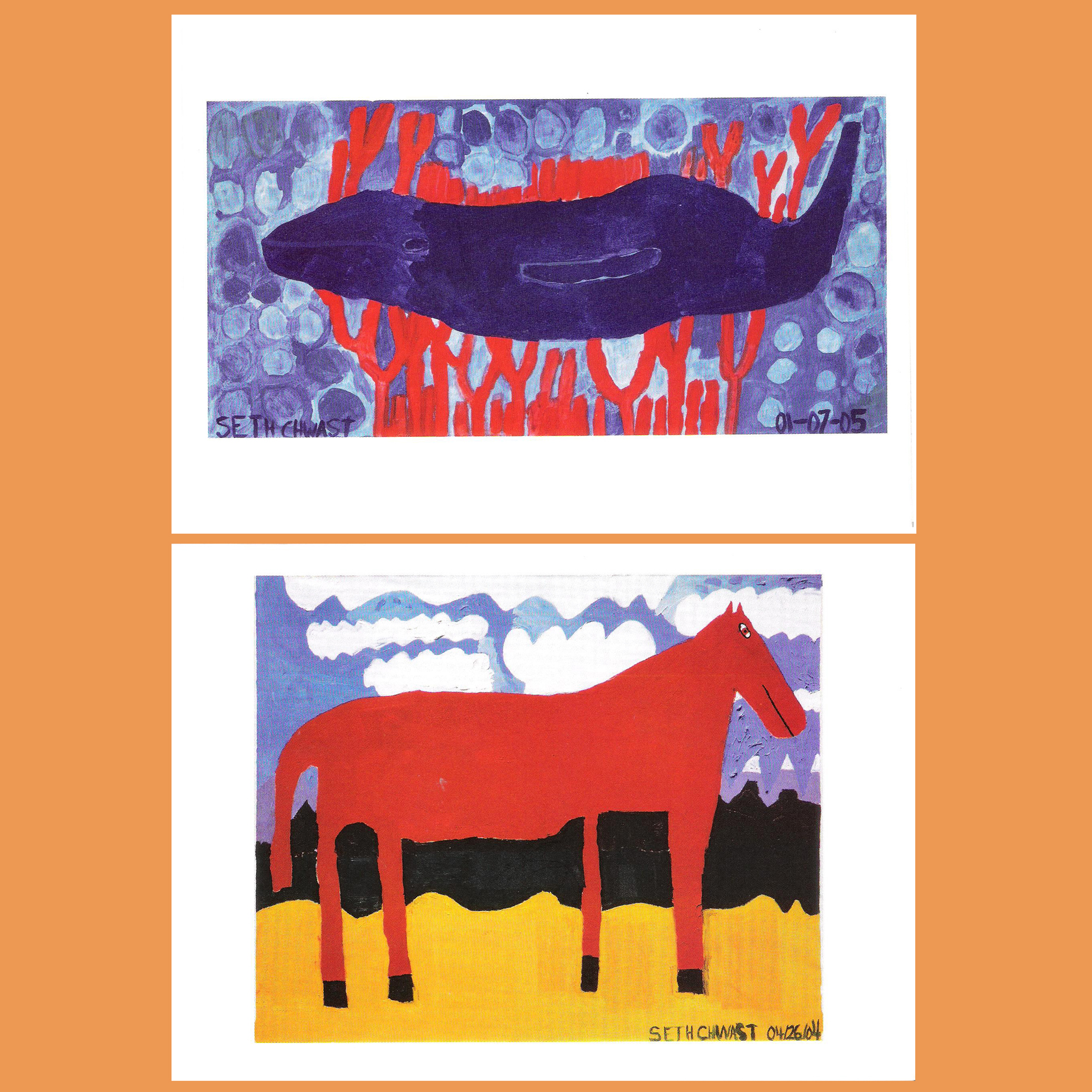 This set includes 12 cards and 12 white envelopes. There are 6 designs from the works of Seth Chwast: